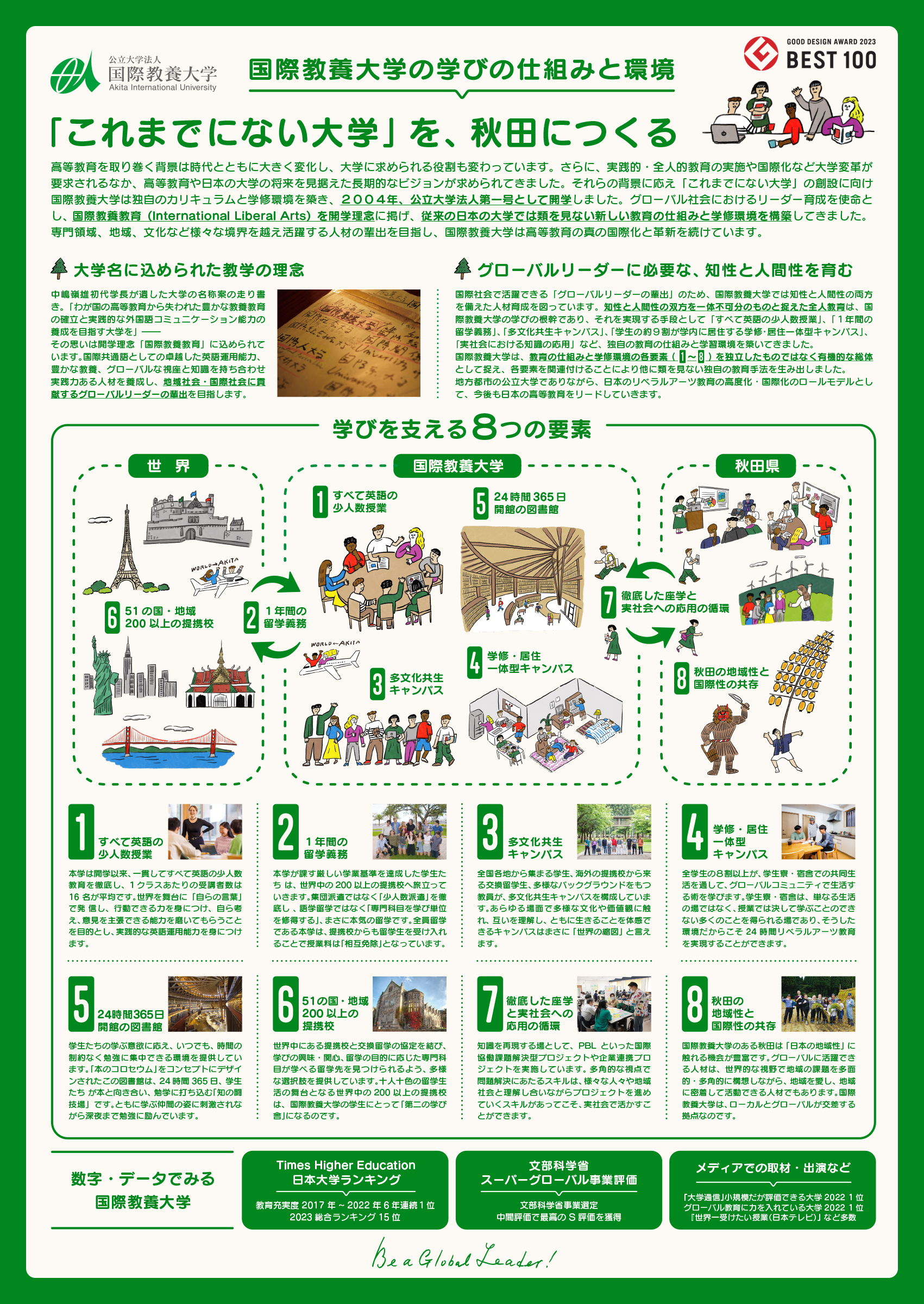 来年4月に開学20周年を迎える本学は、開学当時から「国際教養教育」を教学理念に掲げ、グローバル社会におけるリーダーの育成を使命とし、専門領域、地域、文化など様々な境界を越え活躍する人材輩出を目指した先駆的な取り組みと発信を続けてきました。このたび、「すべて英語の少人数授業」「世界200以上の提携大学への1年間の留学義務」「多文化共生キャンパス」などの要素が有機的に統合された本学独自の高等教育手法を2023年度グッドデザイン賞に出品し、グッドデザイン?ベスト100を受賞しました。